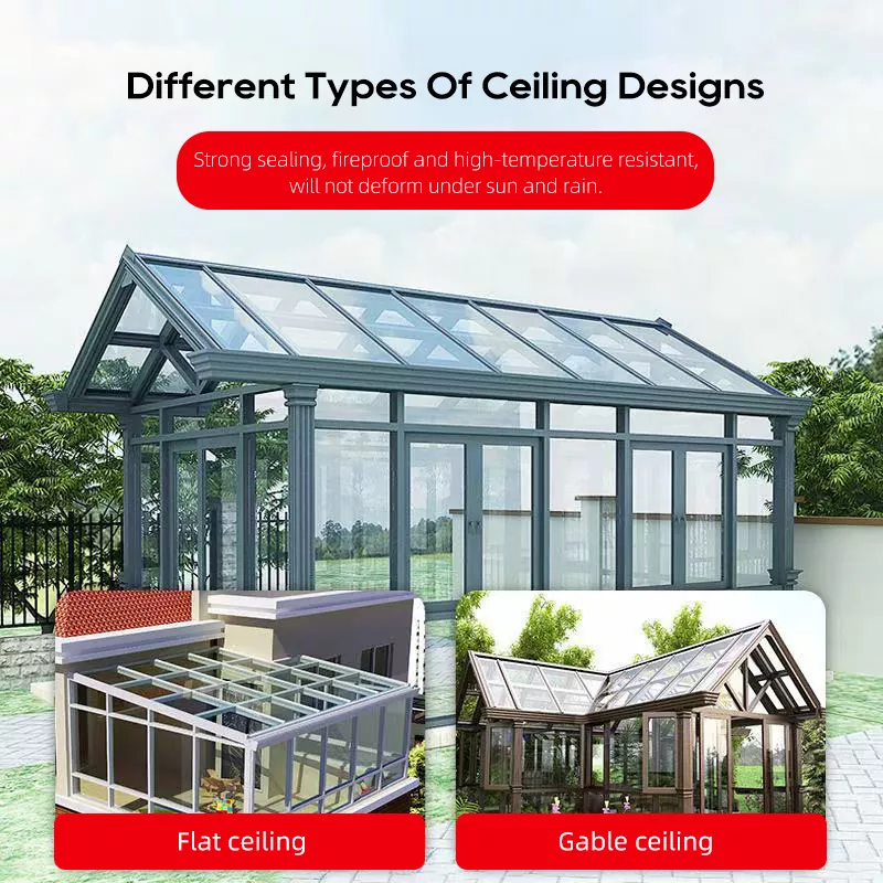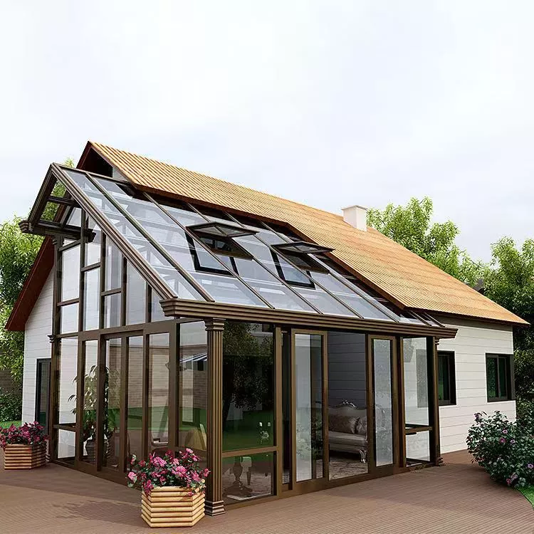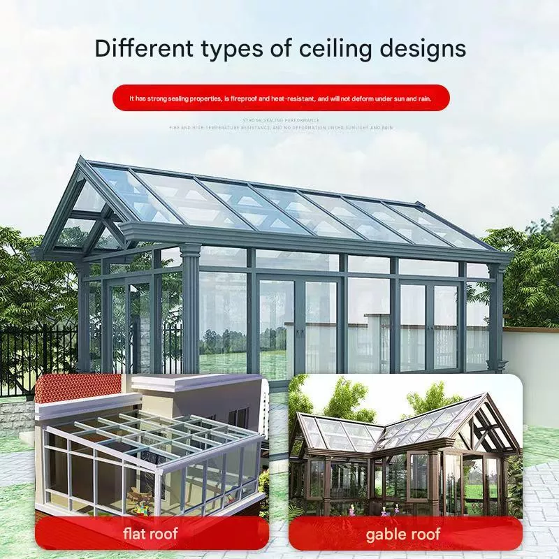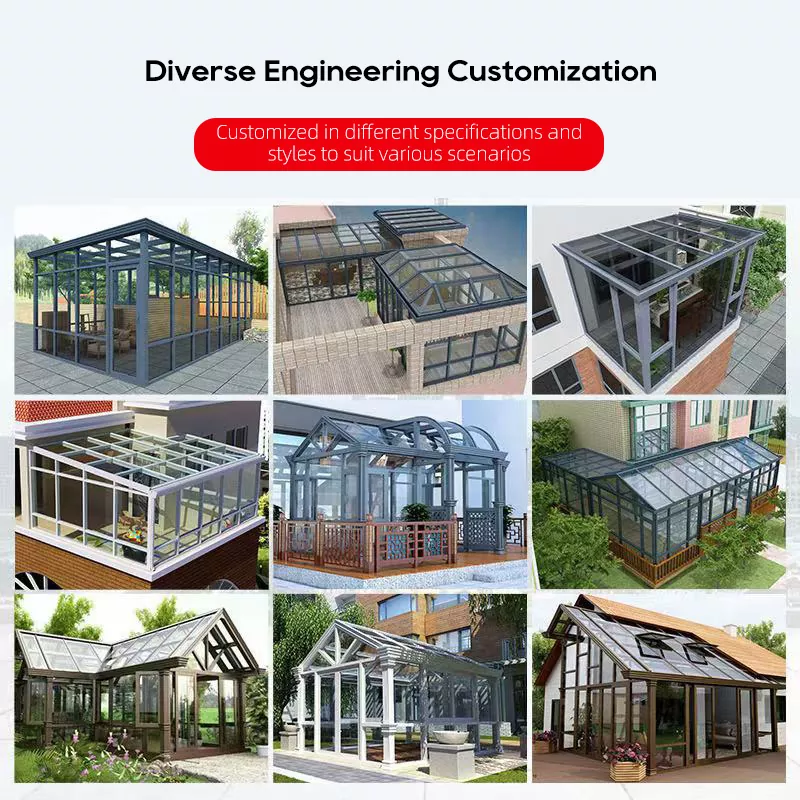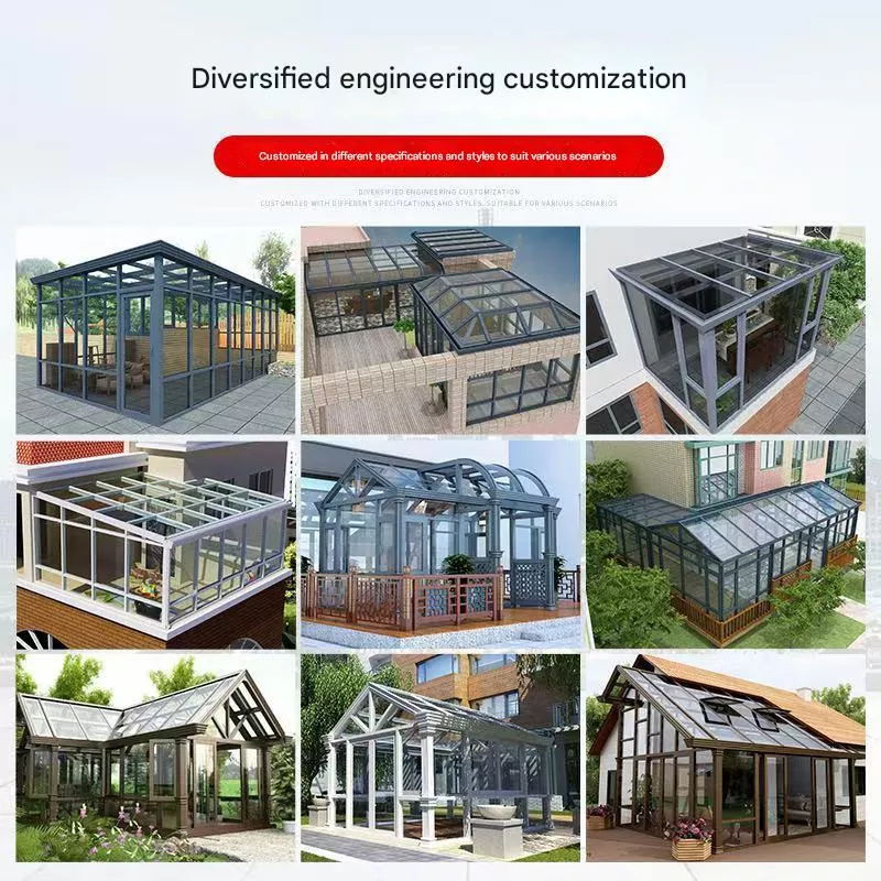 Слънчевата стая приема a алуминиева рамка с термично прекъсване + структура от изолирано закалено стъкло. Рамката се състои от колони, греди и диагонални опори, сглобени чрез модулна система, която поддържа множество стилове на покрива, включително двускатни покриви, плоски покриви и извити покриви.